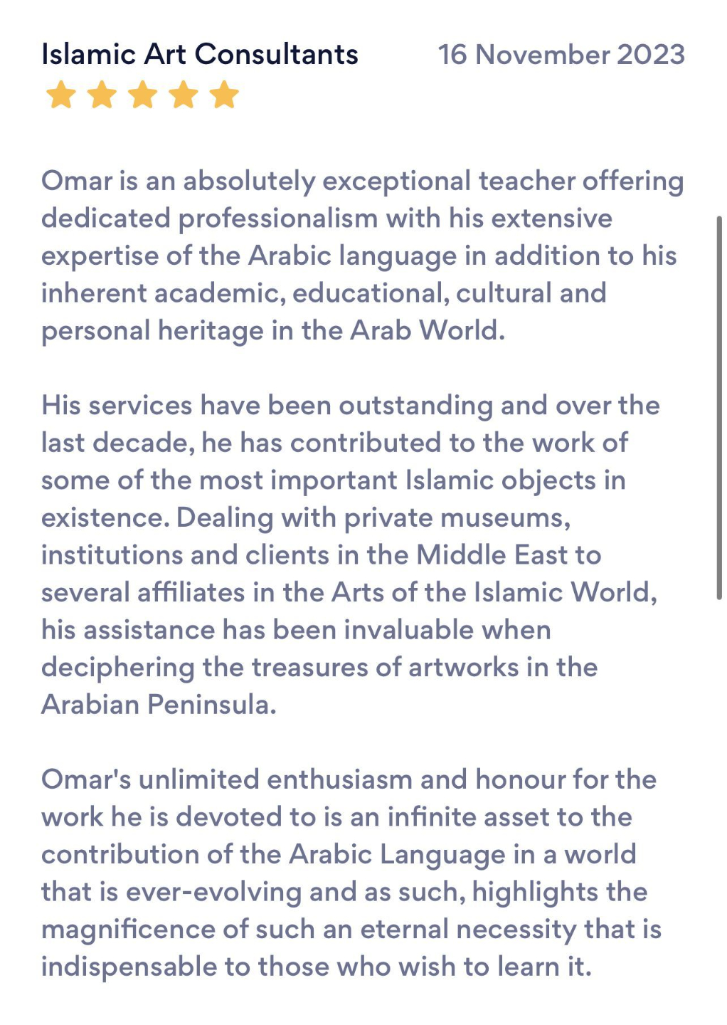 Omar is a fantastic tutor—patient, knowledgeable, and makes learning Arabic enjoyable and effective! I am taking 1 hour weekly lessons as part of training organised by White & Case, I recommend him highly!